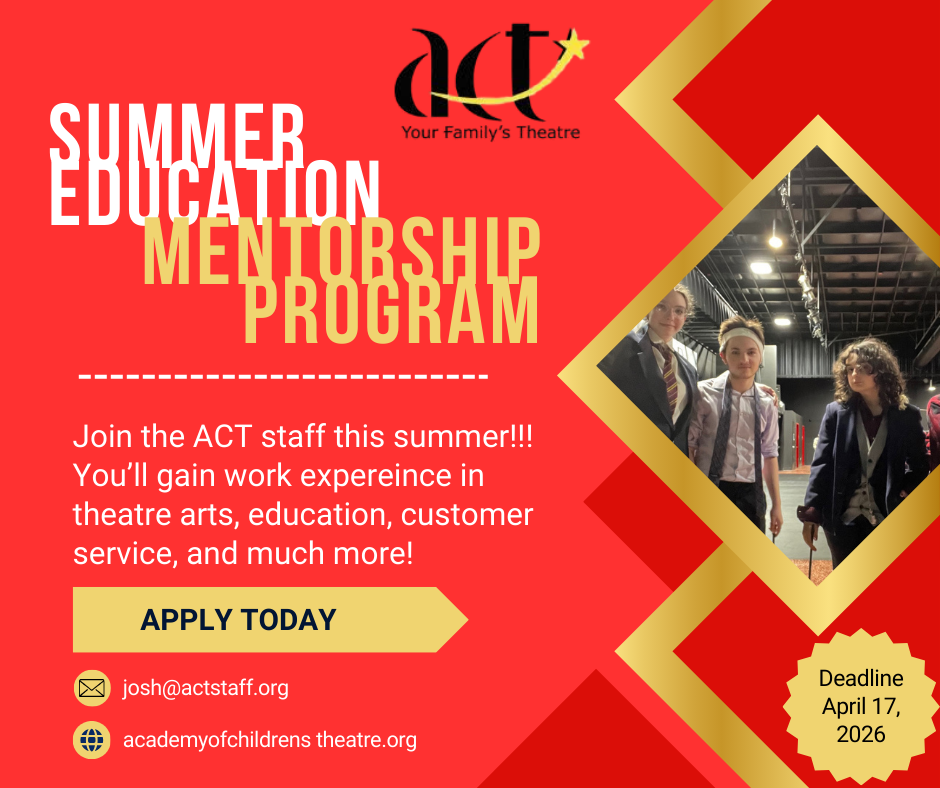 An ACT Summer Educational Mentor is a person who loves theatre and wants to learn the ins and outs of what it takes to run a theatre. During the summer, our mentors are expected to attend our training sessions (usually the third weekend in June), assist in our classrooms, in the office, and to attend the weekly intern meeting (usually on Wednesday afternoons).